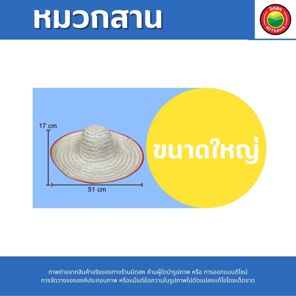 หมวกสานไม้ไผ่ สีขาว กุ้นขอบสีฟ้าและสีแดง มีทั้งหมด 2 ขนาด ดังนี้